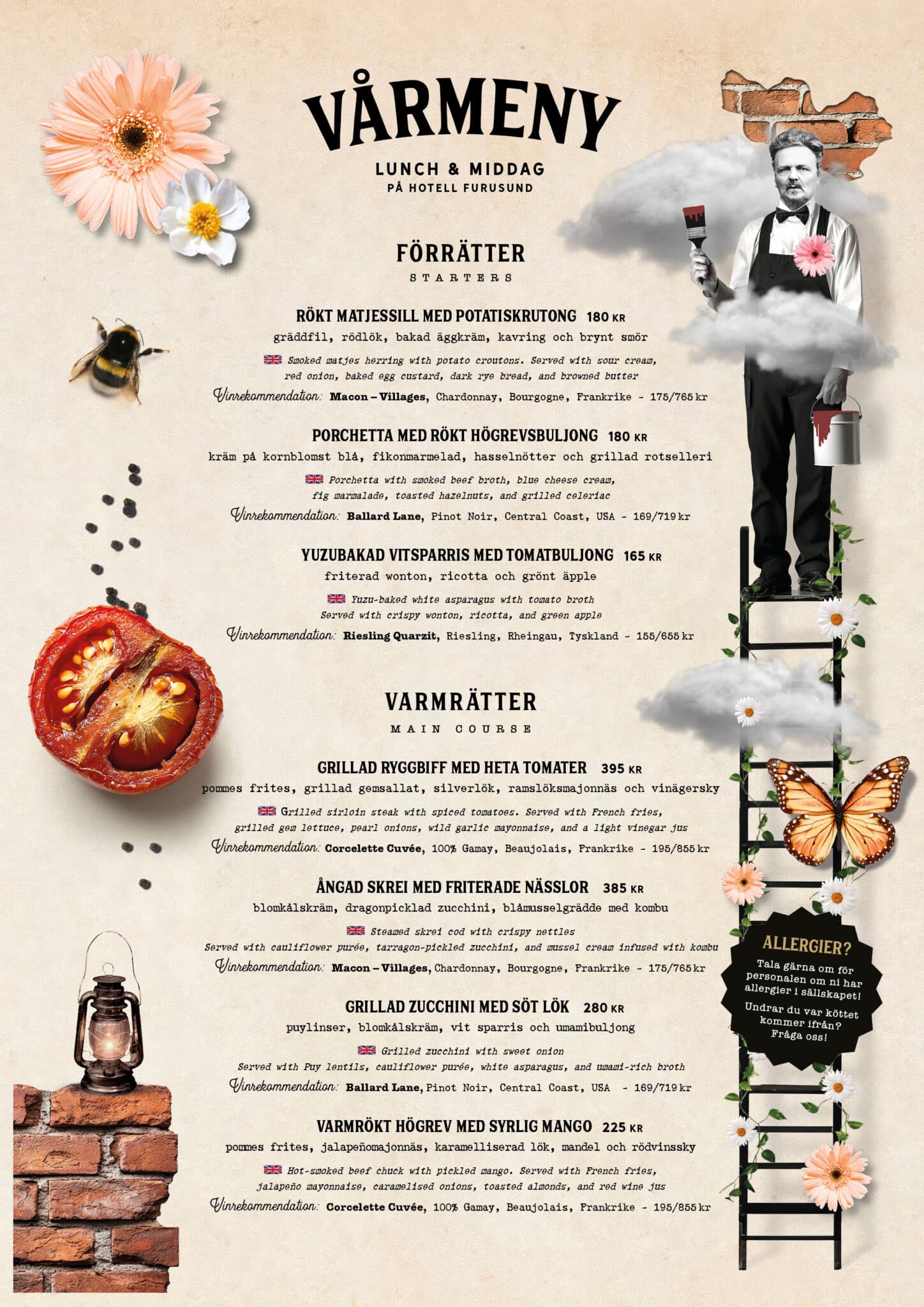 Varsågod, kika på vårmenyn för 2026. Du kan klicka på menyn för att få upp den större på skärmen, sedan är det bara att zooma runt. För frågor ring oss!